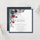 Moderna y elegante ducha cuadrada con un ramo de flores azul marino y borgoña, bordeada de azul marino. Personaliza los detalles de tu ducha de novia en suave color negro, acentuado con una bella caligrafía con letras a mano moderna. La parte posterior de la tarjeta presenta una textura de color azul marino. Copyright Elegant Invita, todos los derechos reservados.