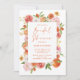 Invitación a la ducha de novia con temática cítrica, con un marco floral acuático de color rosa, blanco y naranja, naranjas y rodajas de cítricos.