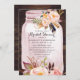 Invitación bohemia a una ducha de novias con flores con un frasco de albañil adornado con rosas rosas rosas rosas rosas, plumas y vegetación en un fondo de madera de granero. Personaliza fácilmente esta encantadora invitación a una ducha de novia floral para complementar tu fiesta de bodas boho.