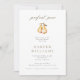 Una elegante invitación minimalista a la ducha de novias con un ilustracion acuático de dos peras y el titular "Perla perfecta" en letra moderna de caligrafía.
