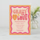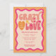 Celebra a la futura novia con estas invitaciones modernas y únicas. Esta invitación temática retro "loca de amor" en melocotón naranja es personalizable con tus propios detalles. ¡Elige tenerlas impresas, recibirlas como descarga digital o ambas!