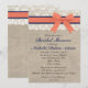 Una elegante y rústica invitación a la ducha de novia con un aspecto de burrega. Acentuado con encaje blanco y una cinta coralina y marina.