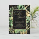 Esta moderna pareja tropical invita a bañarse en una boda con palma verde y dorada, philodendron y hojas de helecho sobre un fondo negro. Un marco dorado elegante resalta el texto dorado. Las salpicaduras de oro acentúan este diseño botánico exótico y le aportan un poco de sofisticado capricho a la invitación. Este oasis de la isla es perfecto para cualquier ducha exterior, de playa o tropical temática.