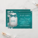 Un magnífico agua azul turquesa verde azulada tonificación luciérnaga barro de masón parejas matrimonio invitación a la ducha de boda que parece que brilla. Añada las iniciales y/o el monograma de la novia y el novio al frasco con un diseño de cinta impresa en azul y blanco. Una sutil frontera de encaje antiguo adamascado adamascado complementa este diseño rústico y elegante con bonitas luciérnagas dentro y fuera del frasco. Estas invitaciones son hermosas para una noche, un jardín, una casa de campo o una ducha de temática rural o una fiesta de compromiso. Obra de arte © Chrissy H. Estudios, LLC.Todos Los Derechos Reservados.