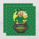 Invitación con una ilustración de un duende sonriente que lleva un traje verde, una corbata de lazo y un sombrero bowler mientras está sentado dentro de una olla de oro y sostiene una pinta de cerveza, con un arcoíris amarillo, verde y naranja en el fondo. La imagen se coloca sobre un fondo verde oscuro sin costuras con tréboles.