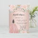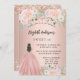 Una invitación moderna, elegante y glamurosa para una fiesta de 16 y 16 años. Un fondo dorado rosa con flores rosadas de color, un chica vestido de bata de bolas. El nombre está escrito con una escritura de estilo con letras a mano moderna. Personalice y agregue los detalles de su fiesta.