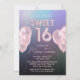 Esta invitación a la fiesta Sweet 16 tiene un tema colorido y glamuroso. El título "Sweet 16" está impreso en globos de Relieve metalizado rosado, con globos fiestas de color rosa suave colocados a ambos lados. El fondo presenta un gradiente holográfico oscuro de arco iris o iridiscente.
