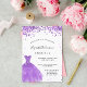 Una invitación moderna, elegante y glamurosa para una fiesta de 16 y 16 años. En la parte delantera, un fondo blanco con violeta, brillo de lila, un vestido violeta. El nombre está escrito con una escritura de estilo con letras a mano moderna. Personalice y agregue los detalles de su fiesta.