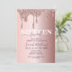 Elegante, alegre invitación con goteo de purpurina rosado sobre un fondo metálico de oro rosa. Tipografía elegante para sus detalles únicos. Fácil de personalizar. Añade tu foto a la parte posterior, incluye el overlay de oro rosa