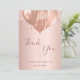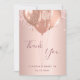 Una tarjeta de agradecimiento por un dulce 16, 16 cumpleaños. Un color de fondo rosa de color falso dorado metálico. Con goteos falsos de purpurina, pinturas que gotean y globos. En el frente, gran guión de color rosa oscuro con letras de color oro y el texto: Gracias, tu texto, título y una fecha. Parte posterior: plantilla para su nota de agradecimiento y nombre.