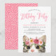 Agradables invitaciones para fiestas de cumpleaños con temática de gatos, con la presentación de "Fiesta de Cumpleaños" en un capricho rosado con un gato acuarela pintado con una corona de flores rosadas y malvas. Personalice las invitaciones de la fiesta de cumpleaños con temática de gatitos con el nombre del chica de cumpleaños y los detalles del fiesta. Las invitaciones se invierten para mostrar patrones de puntos rosados y blancos.