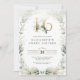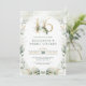 Esta elegante invitación a los 16 años con temática botánica presenta hermosas hojas de color agua verde y dorado y una tipografía elegante que combina texto moderno y limpio con un toque de caligrafía