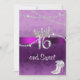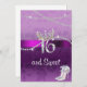 Hermosa invitación Sweet 16 tiene un fondo de damasco morado con cinta de satén color púrpura, corona de princesa diamante brillante, cuerdas de diamante colgantes y tacones elegantes y ondulados.
