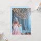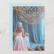 Un hermoso salón de baile fiesta con una chica adolescente usando un vestido rosa y blanco magnífico en su celebración Sweet Sixteen. La sala está decorada con cortinas azules, elegantes lámparas de cuerda y destellos de bonito. Personaliza con tu información de fiesta, nombre de chicas, etc.
