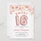 Dulce invitación a la fiesta de cumpleaños 16. Elegante diseño en falso oro rosa purpurina con acento floral. Invitar tarjeta con rosa de oro número 16 globos, letra de guión con confeti. Rosa de coral Rubor, blanco. Perfecto para una elegante celebración del 16º cumpleaños. Mándame un mensaje si necesitas edad personalizado.