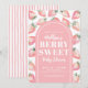 Un tema de fiesta de bebé 'Berry Sweet' lindo y femenino que presenta fresas rosadas de acuarela con hojas verdes. Una mezcla juguetona de tipografía de escritura a mano blanca, serif en negrita y fuentes simples se sienta en un arco rosa suave. Puedes personalizar los colores de la fuente para que coincidan con tu estilo. El color de fondo en la parte delantera, trasera y arco (círculo y rectángulo en el diseño) también se puede cambiar. Incluso las rayas en la parte posterior se pueden personalizar para un toque único.