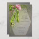 Hermosas flores y guisantes de arvejas rosadas en una vaina adornan este marco geométrico de oro de forma de cristal que contiene toda la información de la ducha de bebé en estilo - iniciado con un título de caligrafía de bonito 'Oh bebé!'