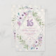 Un marco en forma de diamante con pulverizadores florales de color morado y Relieve metalizado falso morado número 16 texto, sutil de blanco y dorado puntos de fondo.