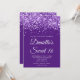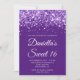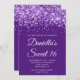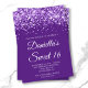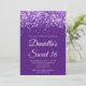 Crea tu propia elegante celebración de 16 años 5X7, invitación vertical para tu hija. Gráficos decorativos de arte digital purpurina brillantemente morado sobre un sólido color de fondo morado oscuro oscuro real. Los lujosos destellos y purpurinas se crearán con elementos artísticos que se imprimirán como una foto. Personalizar el color de los elegantes estilos de fuente.