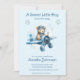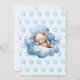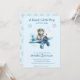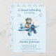 Un lindo oso de peluche en un avión azul vuela a través de las nubes con un par de estrellas por encima bajo la invitación "Un dulce niño está en camino". Todo el texto puede cambiarse fácilmente a su información.