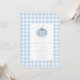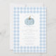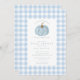 Celebra la llegada de tu pequeña calabaza con nuestra encantadora invitación para baby shower, diseñada en un delicioso patrón de gingham azul. Esta invitación para baby shower de niño presenta un adorable motivo de calabaza, lo que la hace perfecta para dar la bienvenida a un nuevo miembro de la familia. Invita a tus seres queridos a compartir la alegría de esta ocasión especial con un toque de encanto estacional.