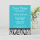 Esta invitación del dulce 16 de la cebra de la diversión es fácil de personalizar para su fiesta de cumpleaños. Las características del diseño un modelo blanco y negro del estampado de zebra y lunares azules verde azulados. Utilice los campos en línea de la plantilla para cambiar el texto para su acontecimiento.