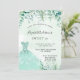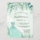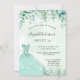 Una invitación a la moda para una fiesta de dulces 16, 16 años, tema del bosque encantado. Un fondo de color verde acuático con helechos y eucaliptos, un vestido verde. El nombre está escrito con una escritura de estilo con letras a mano moderna. Personalice y agregue los detalles de su fiesta.