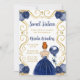 Esta dulce invitación de dieciséis años tiene un marco dorado elegante, una bella princesa con el pelo rojo y un vestido azul marino, flores y un globo. Es perfecto para una dulce fiesta de 16 años.