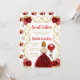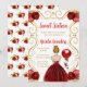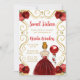 Esta dulce invitación de dieciséis años tiene un marco dorado elegante, una bella princesa con el pelo rojo y un vestido rojo, flores y un globo. Es perfecto para una dulce fiesta de 16 años.