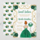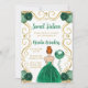 Esta dulce invitación de dieciséis años tiene un marco dorado elegante, una bella princesa con el pelo rojo y un vestido verde, flores y un globo. Es perfecto para una dulce fiesta de 16 años.