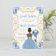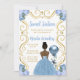 Esta dulce invitación de dieciséis años tiene un marco dorado elegante, una bella princesa con piel oscura y un vestido azul polvoriento, flores y un globo. Es perfecto para una dulce fiesta de 16 años.