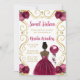 Esta dulce invitación de dieciséis años tiene un marco dorado elegante, una bella princesa con piel oscura y un vestido rojo burdeos, flores y un globo. Es perfecto para una dulce fiesta de 16 años.