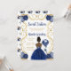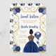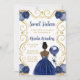 Esta dulce invitación de dieciséis años tiene un marco dorado elegante, una bella princesa con piel oscura y un vestido azul marino, flores y un globo. Es perfecto para una dulce fiesta de 16 años.