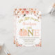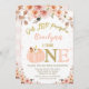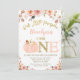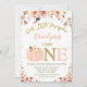 Dulces Chicas Rústica Caída Calabaza Primer Cumpleaños Invitación Cuta rústica calabaza floral de primer cumpleaños invitación para una niñita con calabaza, algunos arreglos florales y purpurina de oro y acuarela textos y puntos. Esta pequeña calabaza está haciendo que la invitación de un chica por su primer cumpleaños sea ideal para una fiesta de primer cumpleaños del chica otoño.
