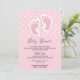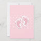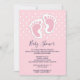Invitación de baby shower con una adorable imagen de huellas de bebé niña rosa con un contorno blanco grueso y lunares blancos sobre un fondo rosa detrás de la ilustración.