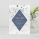 Flores de invierno en tonos azul polvoriento, verde salvia, blanco y crema rodean un marco en forma de diamante de azul polvoriento con los detalles bodas en el interior. Los cuadros de texto son fáciles de personalizar utilizando una combinación de fuentes modernas y caligráficas en azul polvoriento medio gris y oscuro. El dorso de la tarjeta es azul polvoriento oscuro.