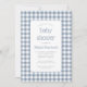 Esta invitación a la ducha para bebés tiene un fondo rústico a cuadros de gingham blanco y azul polvoriento. El texto aparece en un rectángulo blanco con un delgado borde azul polvoriento y esquinas redondeadas, con las palabras "baby ducha" y el nombre de la futura madre en una encantadora tipografía azul polvorienta y el texto restante en letra gris sans serif. Ideal para una ducha para niños o chicas. El patrón de gingham se repite en la parte posterior de la tarjeta.