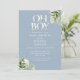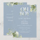 Invitación de baby shower oh boy que incluye el código QR de tu registro y todos los detalles de tu fiesta de baby shower en tipografía elegante y hermoso follaje botánico en un fondo azul polvoriento. Diseñado por Thisisnotme©