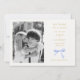 Moda y elegancia. Esta magnífica tarjeta de fecha para guardar es una adorable cinta de color azul polvoriento, fuente contemporánea de imitación dorada contra un fondo blanco roto y foto de pareja. Dos iniciales opcionales en la parte posterior con detalles de cinta de repetición. Memorable y único, esta carta exime de elegancia, alegría y encanto.