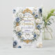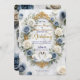 Invite your guests to a "happily ever after" event with this enchanting design that captures the magic of true love. Featuring graceful swans and lush floral details, this aesthetic perfectly sets the tone for a formal spring ceremony or a sophisticated winter celebration. The romantic imagery serves as a beautiful keepsake for friends and family long after the big day.A digital illustration featuring a faux gold baroque oval frame centered on a clean white marble background. Two white swans face each other at the bottom, creating a subtle heart shape with their curved necks. A lush wreath of watercolor dusty blue and white roses, accented with sage and eucalyptus greenery, surrounds the metallic-effect frame. Inside the oval, a black silhouette depicts a groom kneeling to propose to a bride, flanked by customizable monogram initials in circles. The event details are typeset in a mix of deep navy blue serif fonts and elegant gold-tone calligraphy script. Please note that all gold and marble textures are flat printed ink, not real foil or stone.