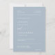 Esta elegante y moderna invitación a la boda minimalista combina una fuente serif limpia con una bella caligrafía de escritura para las palabras "y" y "contestar", dándole una mirada atemporal y sofisticada sobre un polvoriento fondo azul. El diseño incluye una foto personalizada de la pareja y un código QR que dirige a los huéspedes al RSVP y a los detalles del evento, lo que lo convierte en una combinación perfecta de estilo y comodidad. Pase de verde con esta invitación "todo en uno" ecológica reduciendo la necesidad de tarjetas de detalles y de RSVP adicionales. Simplemente agregue su código QR a la parte posterior de la invitación y comparta la información esencial del boda digitalmente. Personalizar los nombres y la redacción en unos pocos pasos fáciles y personaliza la invitación con su propia foto para un toque único y significativo. Nota: La bella escritura de las palabras "y" y "contestar" junto con las líneas en la parte delantera y trasera y otros elementos de arte gráfico no pueden ser editados, movidos o borrados, Se arreglan. El guión de las palabras "y" y "contestar", junto con las líneas y otras ilustraciones gráficas, no se puede editar, mover ni eliminar. Estos elementos están fijos. Si desea cambiar el color, puede realizar fácilmente el personalizar de la invitación para que coincida con el tema de su boda haciendo clic en "Personalizar la invitación". Puedes personalizar esta invitación con tu texto y compartirla digitalmente a través de texto, correo electrónico o medios sociales. ¿Prefiere un toque tradicional? También tiene la opción de enviar por correo una versión impresa a sus huéspedes, o hacer ambas cosas para mayor comodidad.
