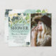 Elegantes invitaciones a la ducha con fotos de novias con un lavado de color verde/azul polvoriento, elegantes hojas botánicas verdes, salpicaduras de falso Relieve metalizado de oro, una foto de la novia y un sencillo patrón de fiesta de ducha de novia que es fácil de personalizar.