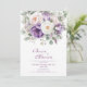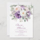 Invite your guests with breathtaking elegance using this sophisticated floral wedding invitation. The design showcases a stunning, lush painterly watercolor arrangement in a romantic palette of dusty purple, lavender, violet, blush pink, and creamy white. Prominent dusty purple roses and peonies mingle with delicate creamy white and blush pink roses, accented by smaller filler flowers and abundant sprigs of dusty blue-green eucalyptus leaves. This exquisite bouquet creates a magnificent top border, framing the clean white central area where your event details will be beautifully displayed. The overall aesthetic is one of refined luxury and timeless botanical charm. Perfect for sophisticated spring, summer, or autumn weddings, this design is also ideal for elegant bridal showers, milestone birthday celebrations, anniversary parties, or upscale garden events. This versatile design can also be adapted for sophisticated corporate galas, charity fundraisers, or elegant announcements requiring a touch of refined floral beauty.