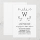 Monograma moderno y sencillo de Whimsical Flourish Save the Date Invitation con un elegante motivo giratorio en negro. Fácil de personalizar, simplemente agregue sus detalles iniciales y bodas en los campos de texto proporcionados. Haga clic en "Personalizar" para encontrar más opciones de personalización.