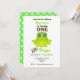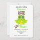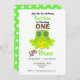 Dibujo lindo para un niño con una divertida rana verde usando la corona de un príncipe, mostrado como primer cumpleaños pero fácil de personalizar con cualquier edad y los detalles de la fiesta de cumpleaños de tu principito sin costo adicional
