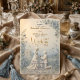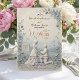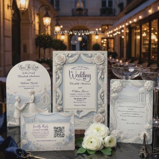 Comparte tu historia de amor con un diseño romántico vintage inspirado, que presenta una elegante paleta de azul polvoriento y marfil, flores 3D falsas y tipografía clásica.Esta composición clásica centra una escena de propuesta bellamente enmarcada contra un paisaje campestre ondulado, representada completamente en tonos suaves de marfil, crema y azul pizarra apagado. El diseño utiliza una jerarquía formal, colocando caligrafía moderna impresa con gracia sobre un borde floral tallado simulado, creando la ilusión visual de la luz direccional que golpea el trabajo de yeso en relieve intrincado.Esta es una imagen impresa plana con un efecto de estampado en relieve 3D falso y de lámina de oro falso, no material realzado.