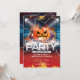 ¡Empieza el fiesta con esta electrizante invitación de Halloween! Este diseño cuenta con un brillante jack-o-lantern rodeado de bolas de discoteca, colocado sobre un fondo de luces y llamas. Perfecto para una fiesta adulta de Halloween, un evento musical de DJ o una espeluznante noche de cata de vinos.