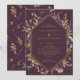 Una rica y oscura y elegante invitación a la boda con flores silvestres acuáticas y hojas alrededor de un marco geométrico dorado sobre un fondo de berenjena oscuro. Personaliza tus detalles con texto dorado. El reverso presenta un patrón de flores silvestres acuáticas también sobre un fondo de berenjenas oscuras. Perfecto para una boda de otoño.