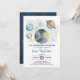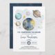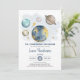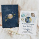Celebra la próxima llegada de tu pequeña estrella con esta mágica invitación a la ducha de bebé en el espacio exterior. Con planetas imaginarios, luna y estrellas de colores azul marino y dorado.