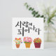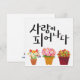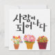 Caligrafía coreana que dice "사 랑 이 피 나" (Amor en Bloom) con vibrantes flores en maceta. Un diseño alegre e inspirador para regalos, impresiones y objetos de estilo de vida.